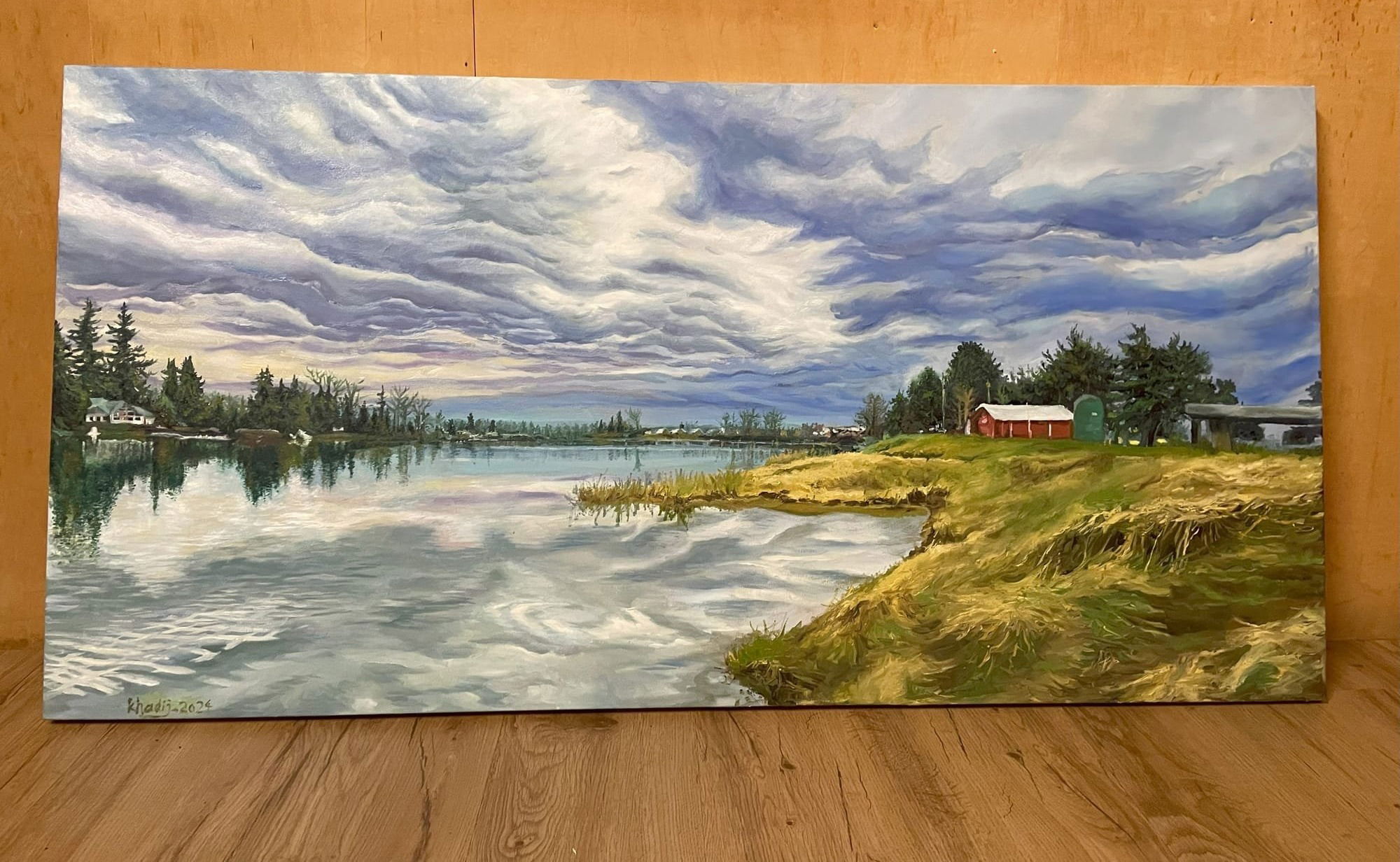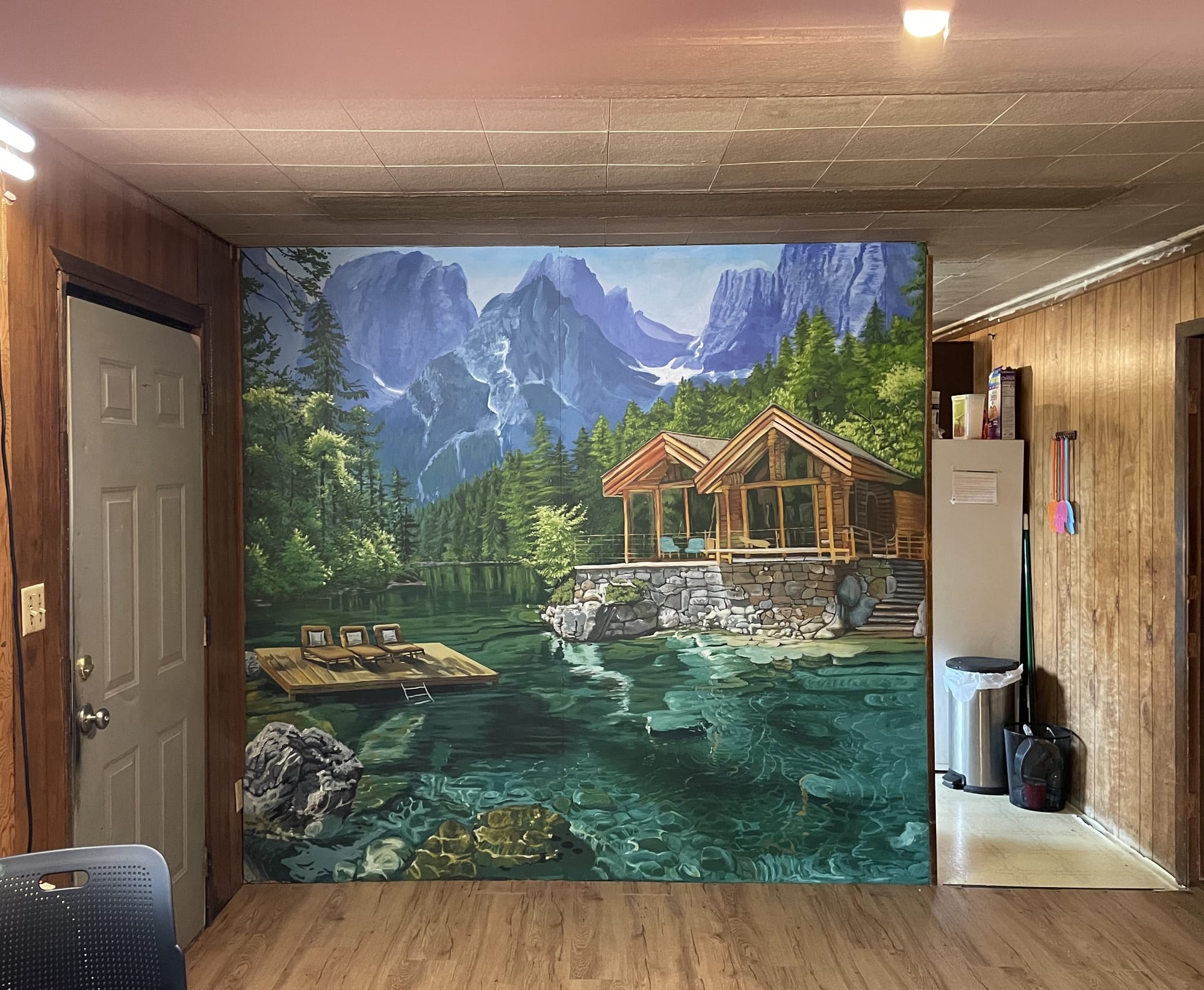 Acrylic material painting on the wall. It is painted on a wood wall and it depicts a lake in a forest, a beautiful house bordering, and a mountain. You can see the clear water and its submerged rocks.